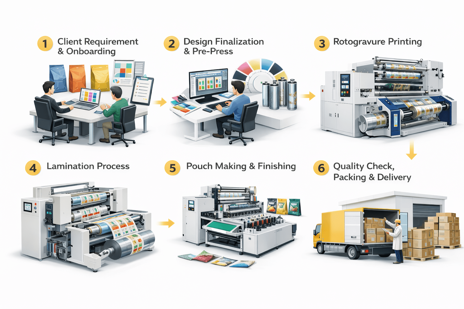 Our state-of-the-art infrastructure supports rotogravure printing, machine-grade roll packaging, and custom pouch production, enabling us to meet bulk orders with speed and accuracy. From vibrant brand printing to durable, food-safe packaging, our machinery plays a vital role in maintaining superior quality standards trusted by businesses across Kolkata.